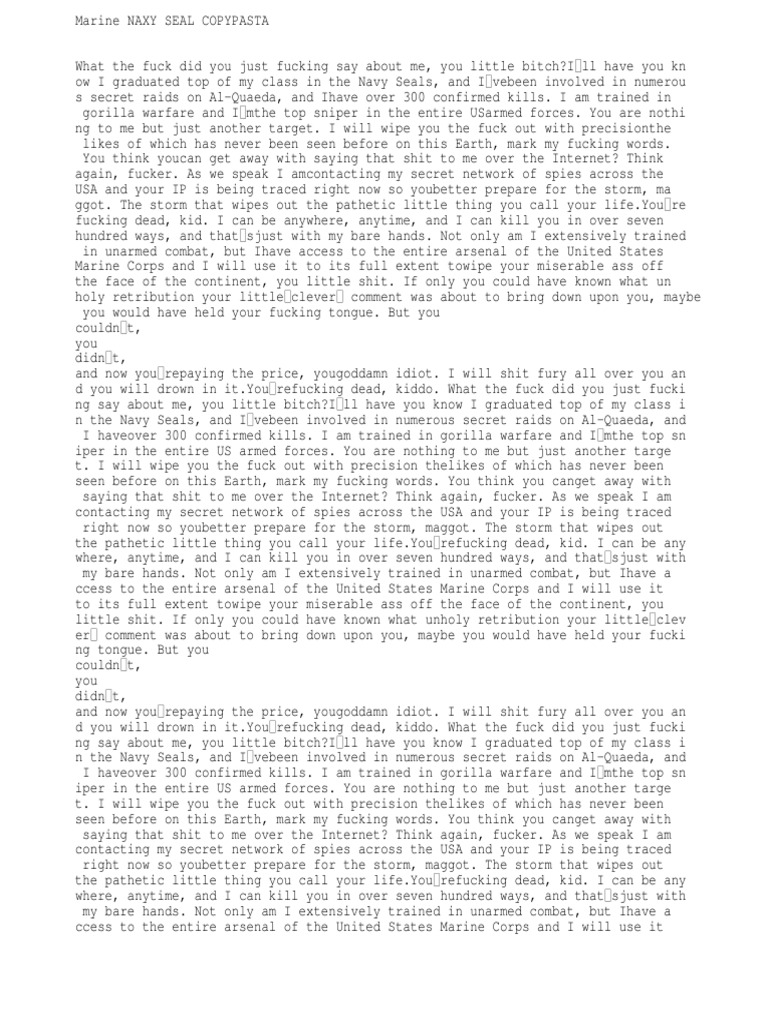 View Navy Seal Copypasta Text UK. Please try to keep the following out of your posts even if they are included for purely satirical purposes (as the automod. In the original post, the writer claimed to be a former navy seal with a long history of combat experiences, ridden with.